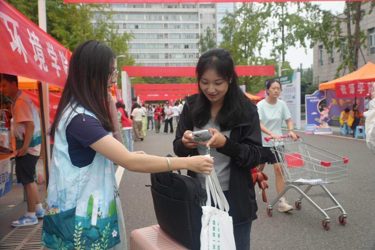 环院迎新点的桌子上,氛围格外热闹,印着“绿水青山”环保主题图案的帆布包整齐码放于桌面,袋内装载的“迎新大礼包”,每一份物品都承载着学院对新生的美好祝愿和贴心期许。