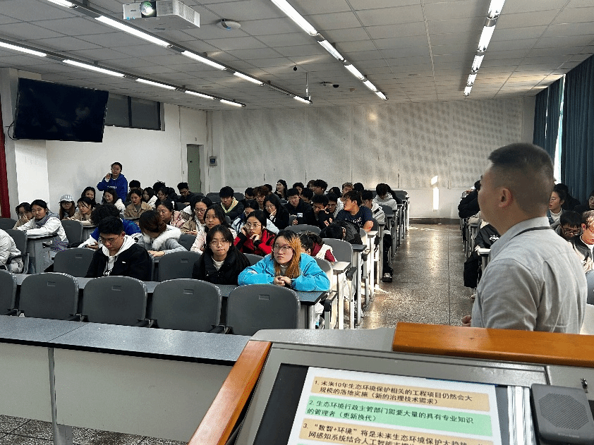 同学们专注地聆听了分享内容,随后积极踊跃地参与交流发言,与田晓刚所长深入探讨和交流了“环境专业本科生如何借助AI赋能”以及“AI技术在环保行业的应用现状与未来趋势”等热点议题。同学们纷纷表示,通过此次交流会,对生态环境领域的理解更加深刻,对行业的发展前景充满信心。