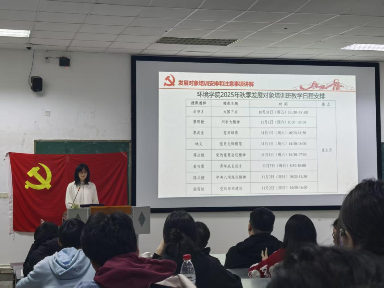 为规范推进发展对象培养工作,确保党员发展质量,环境学院于10月29日在4A108召开2025年秋季积极发展对象培训班动员大会, 本期全体发展对象参与此次会议。