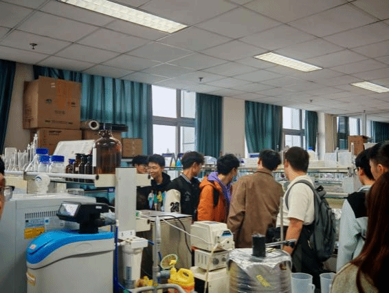 在每组约十五分钟的参观过程中,各实验室安排的志愿者学长学姐们热情地为学弟学妹们进行了细致讲解,介绍了实验室的主要研究方向、大型仪器设备的功能以及操作规范。他们的解说深入浅出,使原本略显神秘的科研工作变得生动而具体。新生们全程专注聆听、积极提问,近距离感受到了科研的严谨与魅力。通过亲身体验和面对面沟通,新生们对学院的科研工作、实验室的运行情况以及未来可能涉足的研究领域有了更为直观的了解,同时也深化了对专业的理解,也更加期待未来的实验学习与科研实践。